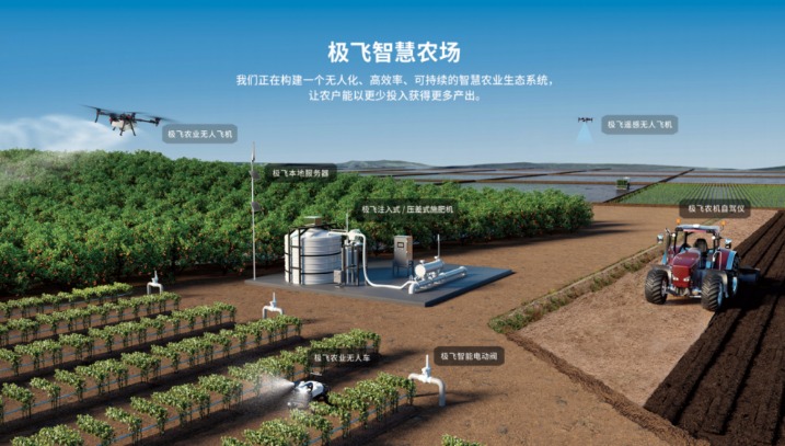 在极飞科技的智慧农场版图里,农业无人机负责进行精确喷洒、智能播撒及巡田;农业无人车与农业无人机形成互补,在果园、温室等经济作物种植场景下,实现精准喷洒农药及农资运输等;农机自驾仪帮助传统农机完成播种、插秧、开沟、起垄、耙地等自动化精准作业;智能农场物联网产品可以持续监测并记录农作物生长及环境的实时数据,提高生产效率与资源利用率。