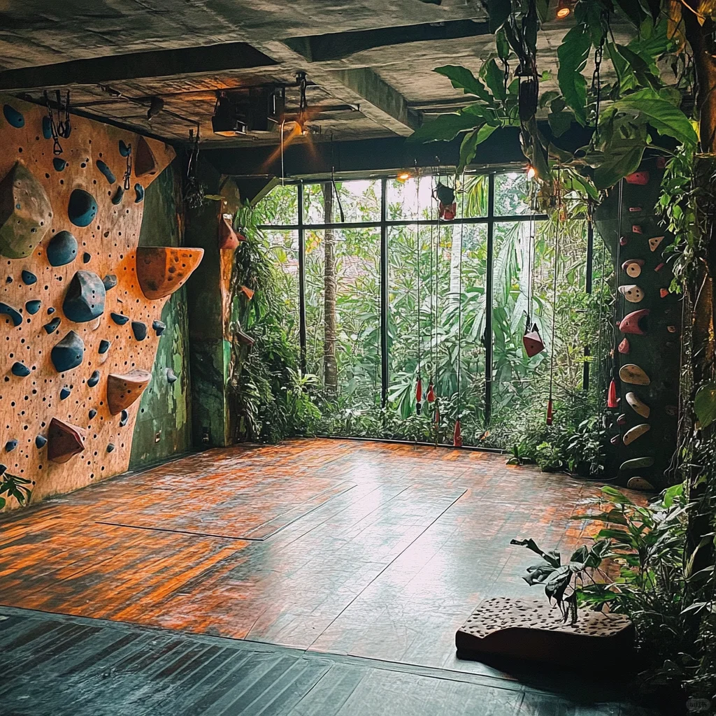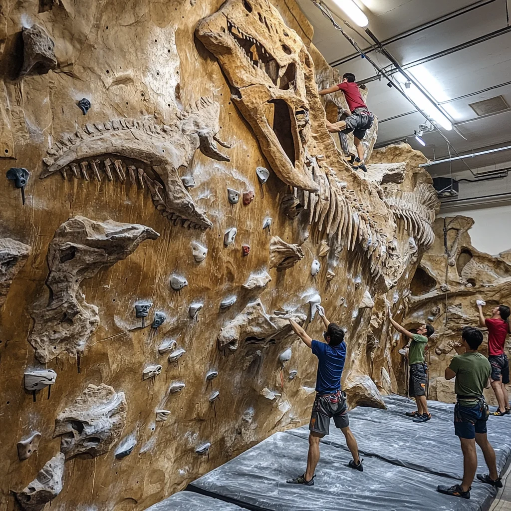 也有网友畅想未来的岩馆模样,给出了一些AI概念图,比如丛林攀岩馆、与侏罗纪公园联名的恐龙化石攀岩馆。