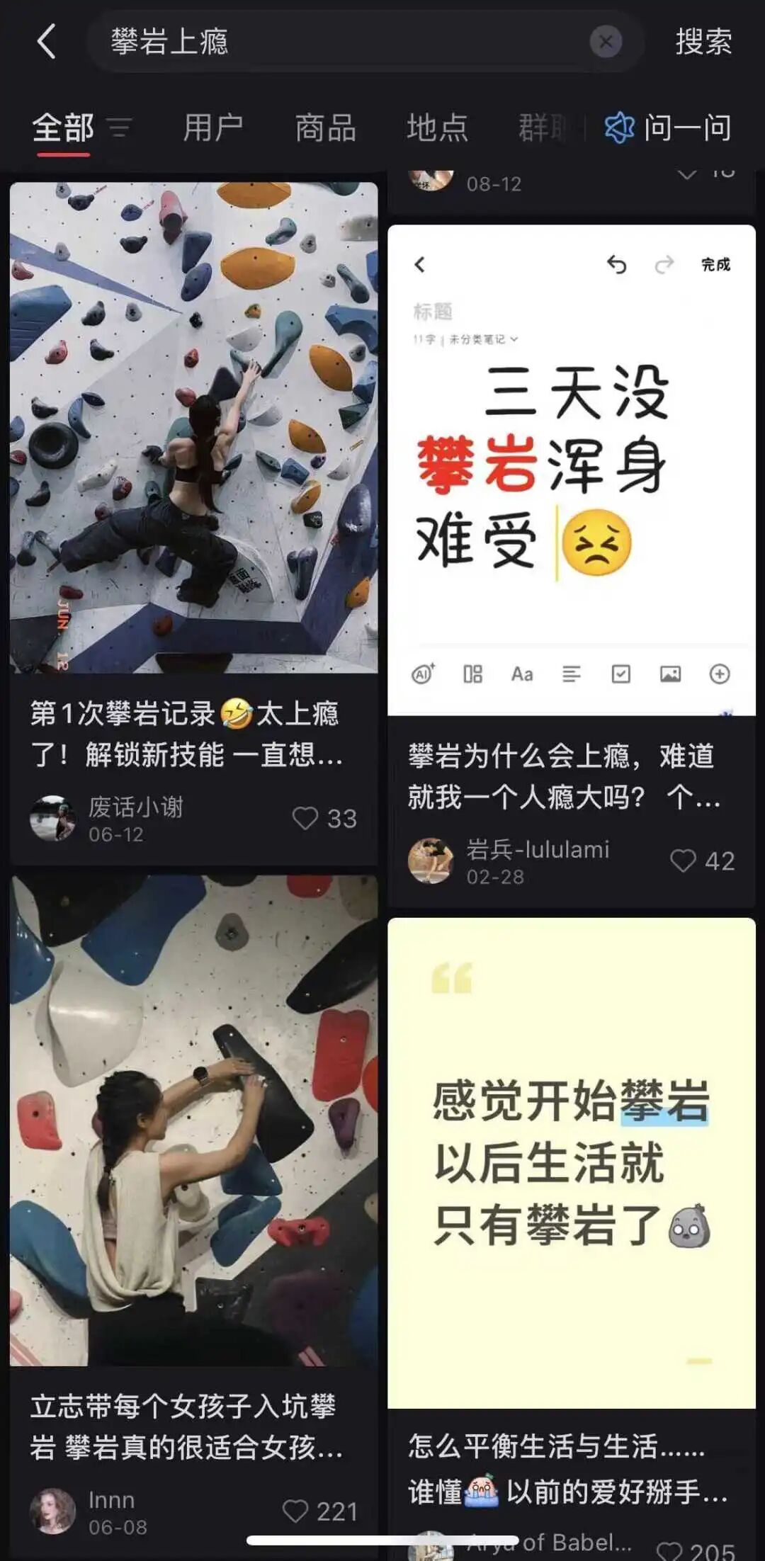 这些正反馈会让人越爬越有动力,越爬越上瘾,忍不住想要挑战更高难度的线路。