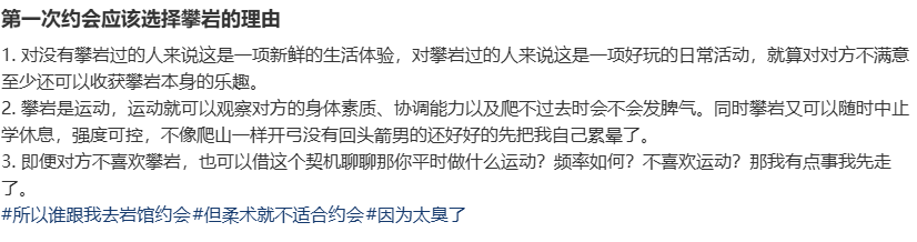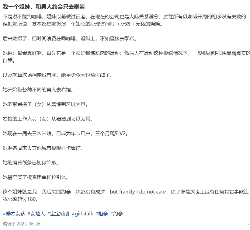 如此看来,攀岩约会似乎更能让人收获快乐,还不需要付出情绪价值。就算对方不太合适,至少攻克了一条新线路,一点不亏。